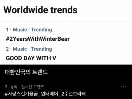 또한 팬들이 전하는 축하메시지는 해시태그를 통해 전세계 SNS 뜨겁게 달궜으며 그 중 '#2YearsWithWinterBear'와 'GOOD DAY WITH V'는 트위터 월드와이드 트렌드 1, 2위를 차지했다.