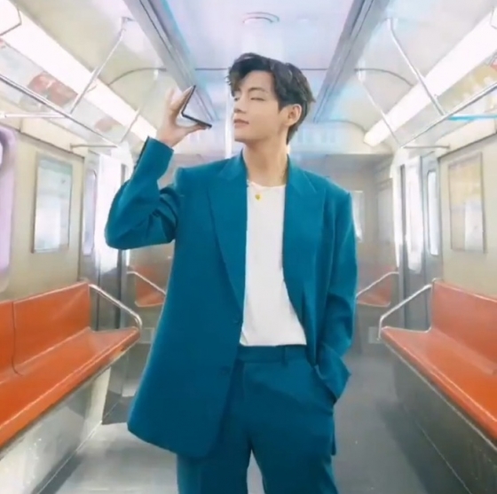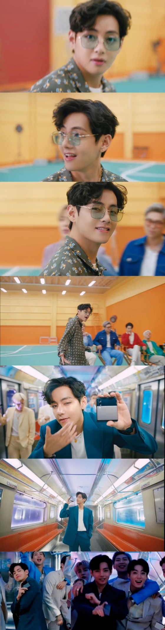 청록색 전신 수트를 입고 안무의 센터에 선 뷔는 Z Flip3를 손에 쥔 채 입술을 지긋이 물고 자연스럽게 웨이브를 타며 치명적인 눈빛을 발산, 독보적인 존재감으로 눈을 뗄 수 없게 만들었다.