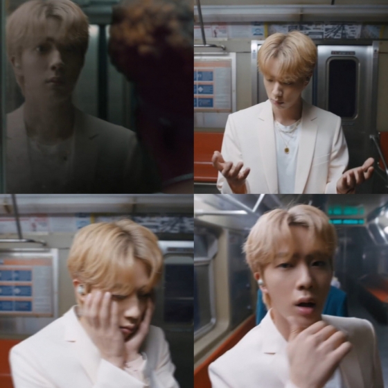 그 순간 진은 눈이 커지면서 깜짝 놀라는 표정을 지었고, 이어서 광고의 포커스는 자연스럽게 진이 있는 지하철로 향했다. 마치 좀전의 여성이 노래를 듣는 순간 진으로 변했다는 듯한 표정을 지으며 양손으로 자신의 얼굴을 만지고 손을 이리 저리 확인하는 등 실감나는 연기를 펼쳤다.