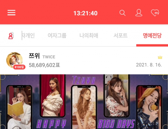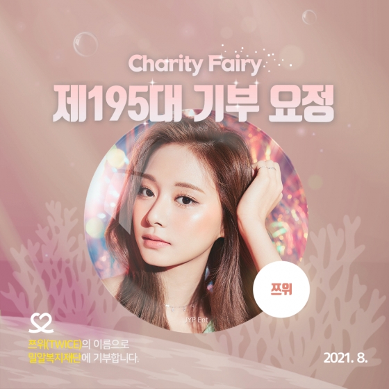 아이돌 순위 서비스 '최애돌'에서 트와이스 쯔위가 국내외 팬들의 열띤 애정을 기반으로 8월 16일 5868만 9602표를 받아 제195대 기부요정으로 선정됐다.