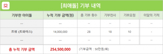 한편, '최애돌'은 최근 30일 동안의 누적 순위를 환산해 1위를 달성하면 기부천사, 각종 기념일에 55,555,555표 이상을 달성하면 기부요정으로 선정해 기부하고 있다.
