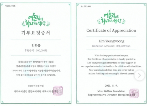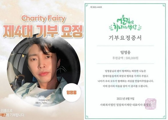기부증서에 따르면 지난 9일 임영웅의 이름으로 밀알복지재단에 50만 원이 기부됐다.