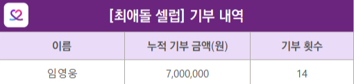 임영웅은 7월 27일 '최애돌 셀럽'에서 7974만 8929표를 받아 가수 부문 제4대 기부요정에 선정됐다. 이날은 임영웅이 태어난 지 11000일째 되는 기념일이다.