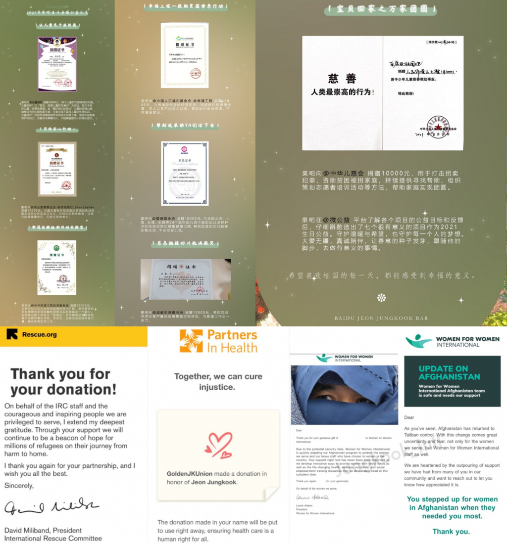지난 20일에는 정국의 해외 팬베이스 'Golden Jungkook Union'이 아프가니스탄과 아이티의 절망적인 상황을 돕고 있는 단체 'International Rescue Committee', 'Partners In Health' 2곳에 '전정국' 이름으로 기부했다.