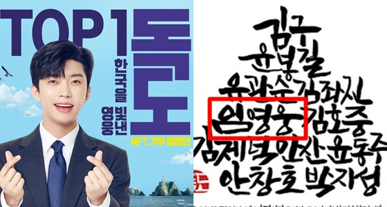 '한국을 빛낸 영웅 TOP10' 1위에 오른 임영웅이 독도 NFT 작품에 김구, 윤봉길, 유관순 등 위인들과 이름을 나란히 하며 눈부신 존재감을 빛냈다.
