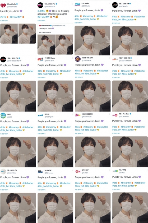 16일에는 미국 라디오 8개의 채널이 '버터' 홍보 중 지민의 '1분11초 킬링파트' 영상을 동시에 장식해 눈길을 끌었다.