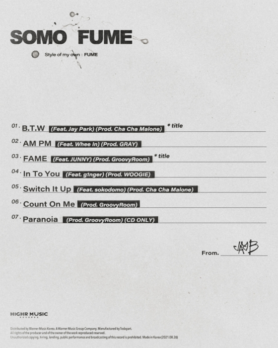 하이어뮤직은 최근 공식 SNS를 통해 오는 26일 발매되는 JAY B(제이비)의 첫 솔로 EP 'SOMO:FUME (소모:퓸)'의 티저 영상과 전체 트랙리스트를 공개하며 음악 팬들의 기대감을 고조시키고 있다.