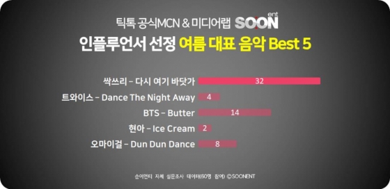 60여명의 인플루언서가 가장 많이 선택한 여름 대표 음악은 싹쓰리의 '다시 여기 바닷가'였다.