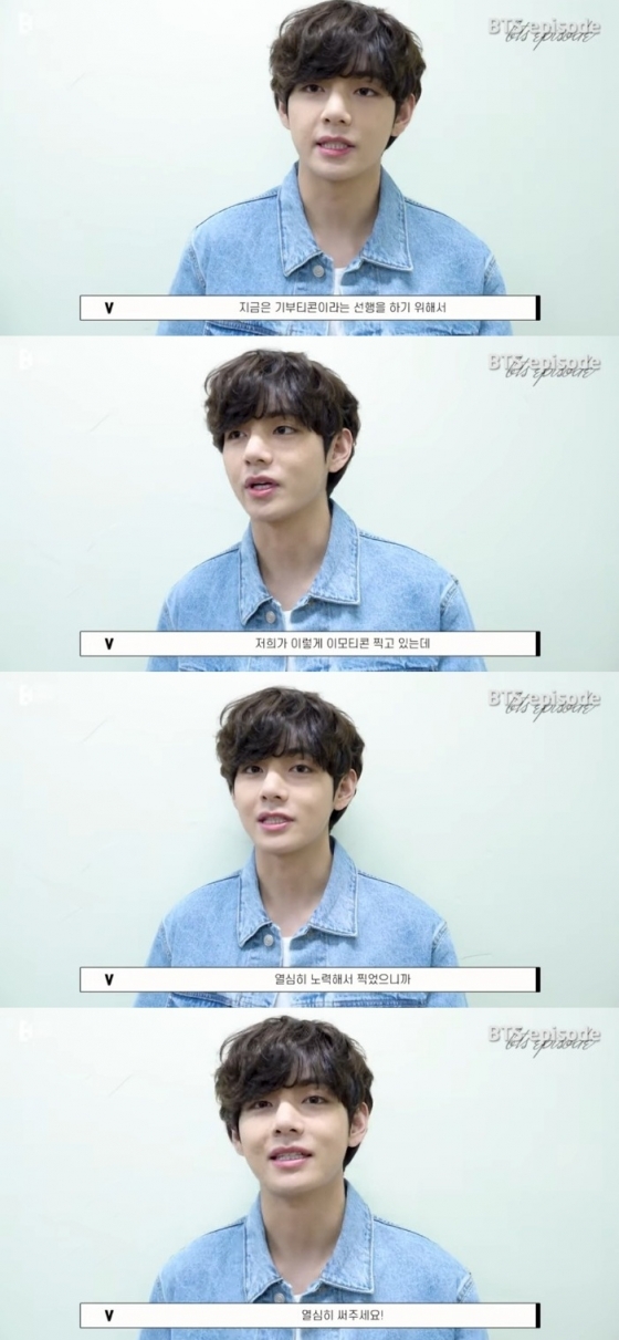 뷔는 "지금은 기부티콘이라는 선행을 하기 위해서 저희가 이렇게 이모티콘 찍고 있는데 열심히 노력해서 찍었으니까 열심히 써 주세요"라고 당부했다.