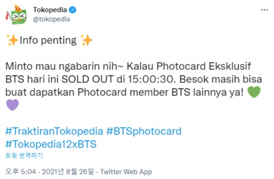 방탄소년단이 모델로 활약 중인 인도네시아 최대 전자상거래 업체 토코피디아(Tokopedia)는 26일 오후 5시(한국시간) 토코피디아 애플리케이션을 통해 진의 토코피디아 12주년 에디션 포토카드 한정수량 2차 판매를 시작했다.
