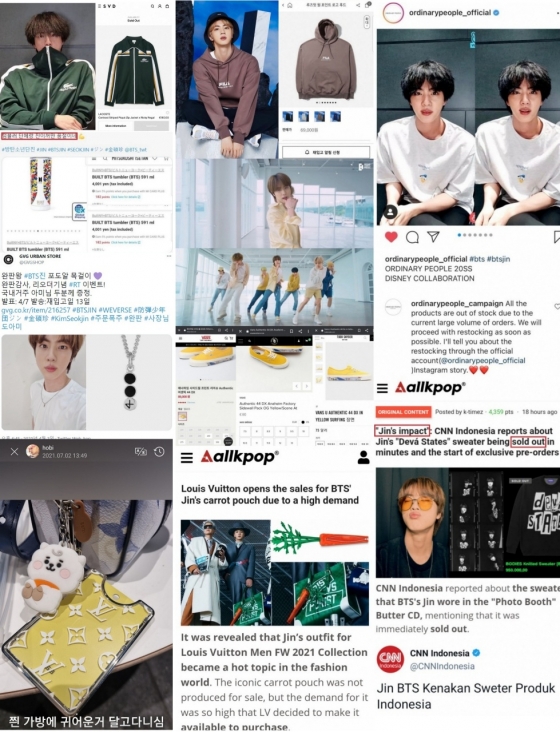 이외에도 진은 집업 스웻셔츠, 후드티셔츠, 버킷햇, 파자마, 운동화, 네크리스, 스웨터, 텀블러 등 스치기만 해도 다양한 아이템을 매진시키는 '진 효과'를 보여주며 완판남의 막강한 '브랜드 파워'를 이어가고 있다.