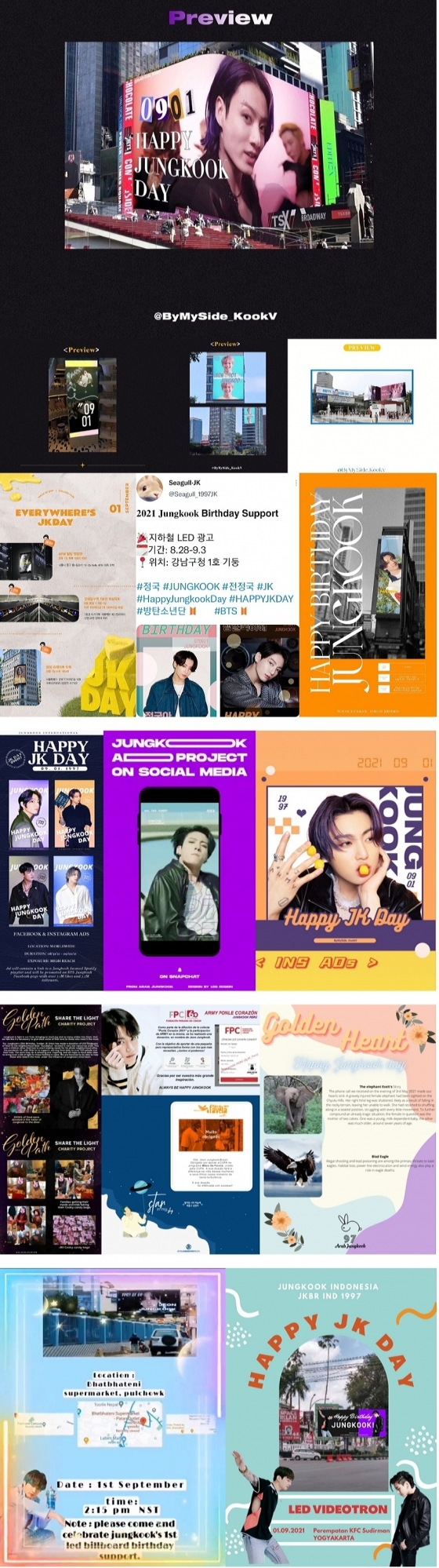 정국의 해외 팬베이스 'Jungkook International'은 8월 31일~9월 2일 페이스북과 인스타그램 생일 광고, 정국의 아랍 팬 베이스 'ArabJungKook'는 9월 1일 유튜브, 인스타그램, 틱톡, 스냅챗 생일 광고, 팬 계정 'ByMySide' 는 9월 1일 유튜브와 인스타그램에서 생일 광고를 진행한다고 공개했다.