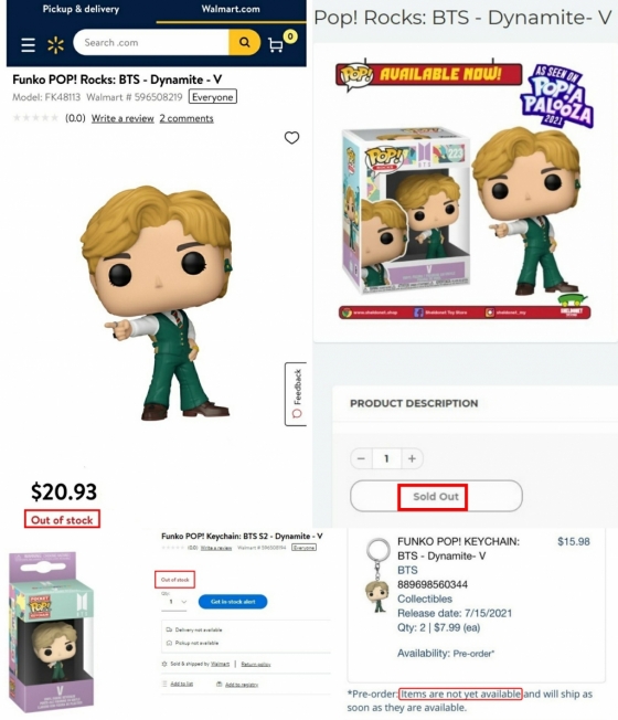 지난 21일 '펀코(Funko)'에서 출시된 'Funko Pop! Rocks;BTS-Dynamite-V' 피규어가 미국 대형 유통업체 월마트(Walmart)에서 또 다시 품절을 기록하며 화제를 모았다.