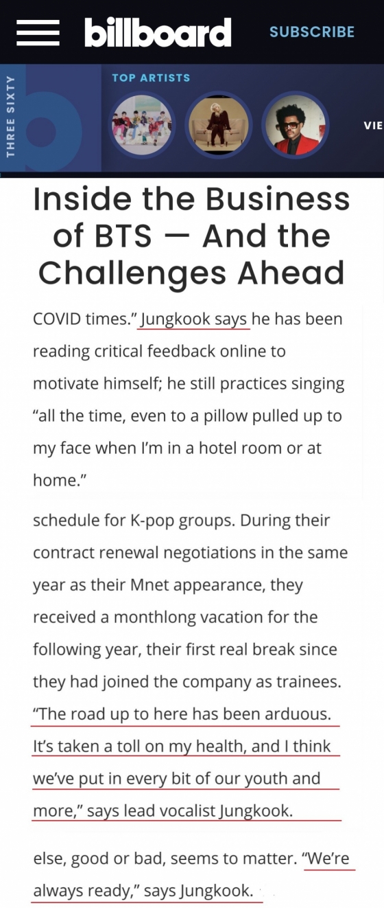 재계약 전의 휴가가 연습생 이후 첫 휴가였다는 빌보드 언급에 정국은 "여기까지 오는 길은 고된 길이었다. 제 건강이 안 좋아진 부분이 있고, 우리 모두 우리 젊음 전부를, 또는 그 이상을 다 여기 쏟아부은 것 같다"고 털어놨다.