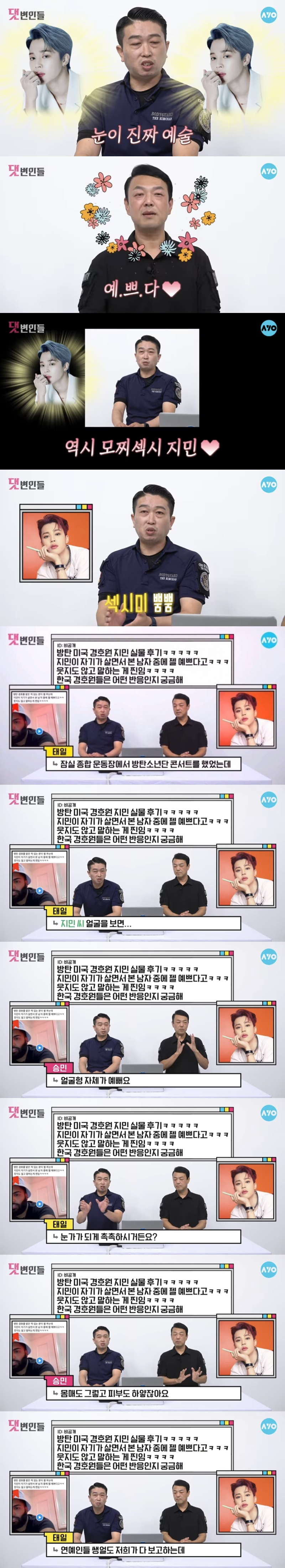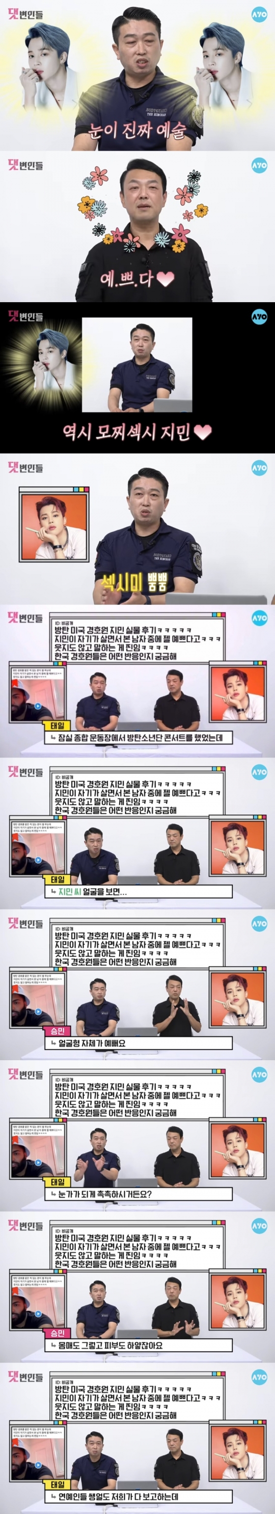 최근 채널A 디지털 전용 채널 'AYO'(에이요)의 '댓변인들' 코너에 수 년간 K팝을 대표하는 아티스트들의 경호를 담당해왔다고 밝힌 현직 경호원 정승민과 양태일이 출연, 지민의 실물 후기를 공개했다.