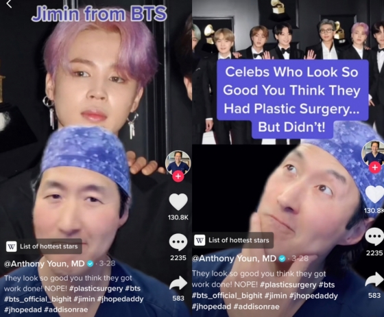 미국의 유명 성형외과 의사이자 390만 팔로워 인플루언서인 'Anthony Youn'는 성형수술을 하지 않은 매력적 세계 유명인 중 '자연 미남' 대표로 지민(JIMIN)을 선택해 예시로 설명했다.