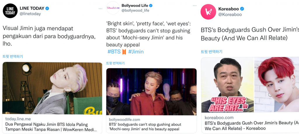미국의 '코리아부'(koreaboo), '발리우드 라이프'(Bollywood Life), '라인투데이'(LINE TODAY)등에서 '방탄소년단의 경호원들이 지민의 아름다움에 감탄했다. 우리는 모두 공감할 수 있다'는 글로 발빠르게 보도에 나서는 등 큰 관심을 표명했다