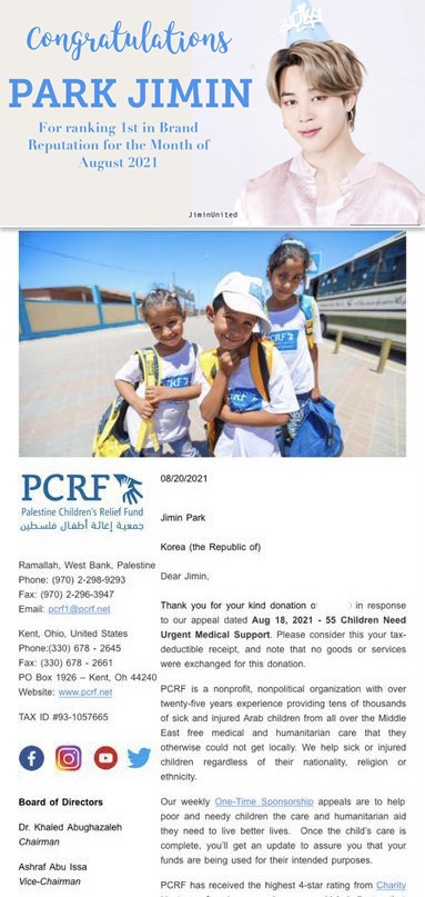 앞서 지민 팬베이스 JIMIN UNITED는 지민의 8월 보이그룹 개인 브랜드 평판 1위를 축하하며 PCRF에 지민의 이름으로 기부했다. 기부금은 55명 아이들의 긴급 의료 지원 등에 쓰일 예정이다.