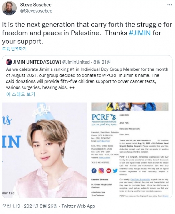 PCRF 설립자 겸 회장 스티브 소세비(Steve Sosebee) 지난 26일 자신의 트위터에 "It is the next generation that carry forth the struggle for freedom and peace in Palestine. Thanks JIMIN for your support"(팔레스타인의 자유와 평화를 위한 투쟁을 이어가는 것은 다음 세대입니다. 지민, 당신의 지원에 감사드립니다)라는 글을 남겨 지민에게 감사를 나타냈다.