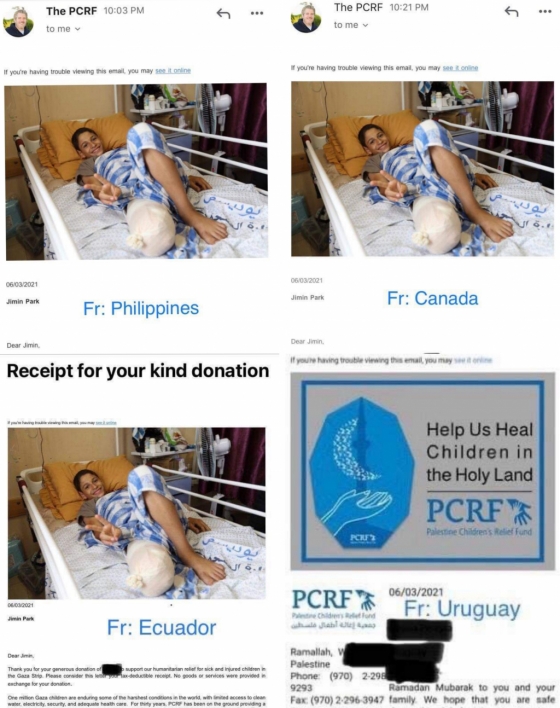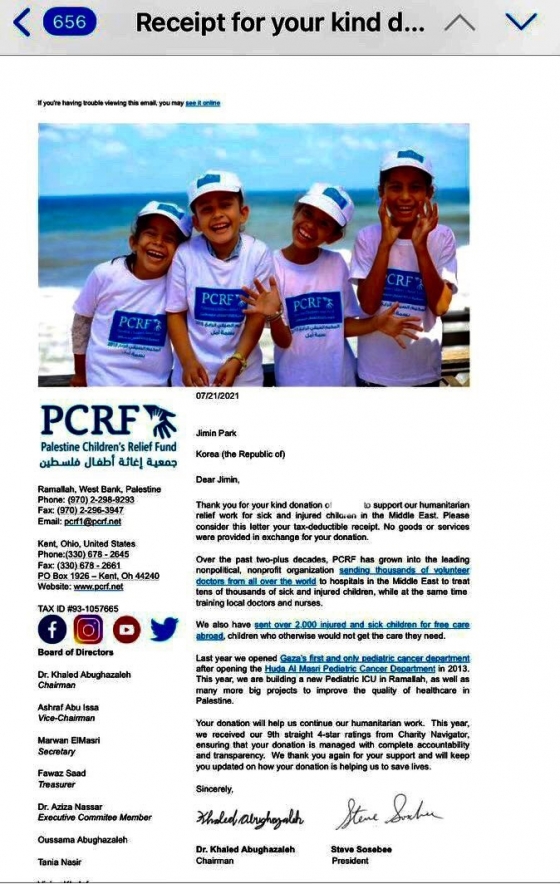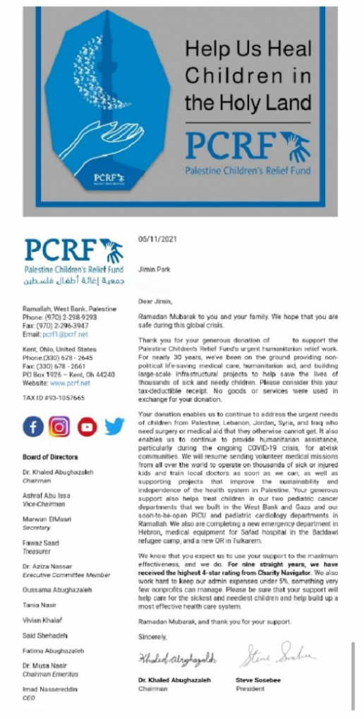 방탄소년단(BTS) 지민에게 팔레스타인 어린이 구호 기금(Palestine Children's Relief Fund, PCRF) 설립자 겸 회장(Founder/President)이 감사를 전했다.