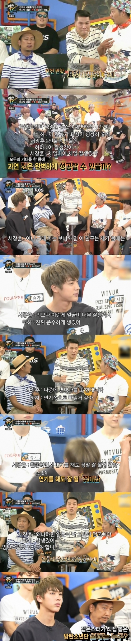 방송인 서장훈은 Mnet '야만TV'에 출연한 방탄소년단을 본 후 "진이 제일 잘생겼어"라며 "진 이 친구는 제가 볼 때는 얼굴이 너무 잘생겨서 활동하면서 연기를 해도 정말 잘될거 같아. 왜냐하면 인물이 딱 드라마 얼굴이야" 라고 진의 실물을 본 소감을 전했다. 배우 이이경 또한 진이 어릴 때부터 엄청났던 미모로 유명했다고 밝혔다.