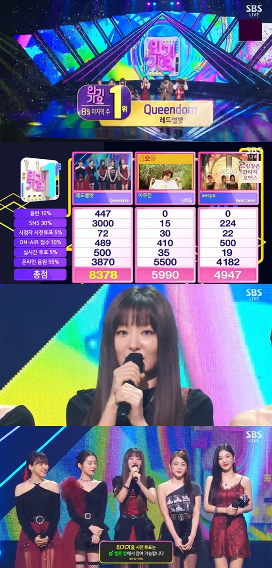 그룹 레드벨벳이 'Queendom (퀸덤)으로 8월 마지막주 '인기가요' 1위를 차지했다.