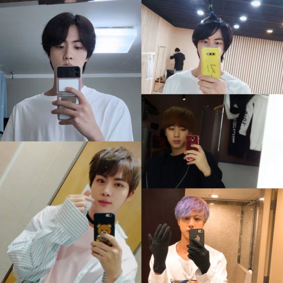 진은 지난 29일 방탄소년단 공식 트위터를 통해 2장의 사진을 공개했다. 공개된 사진속에는 거울을 이용해 셀카를 찍고 있는 진의 모습이 담겨있다.