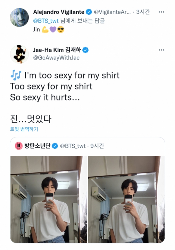 또 뉴욕 타임즈 베스트셀러 작가이자 시카고트리뷴, 버라이어티지의 저널리스트 김재하는 자신의 트위터에 진의 사진과 함께 '진, 멋있다'라는 글을 게재해 남다른 애정을 나타냈다.