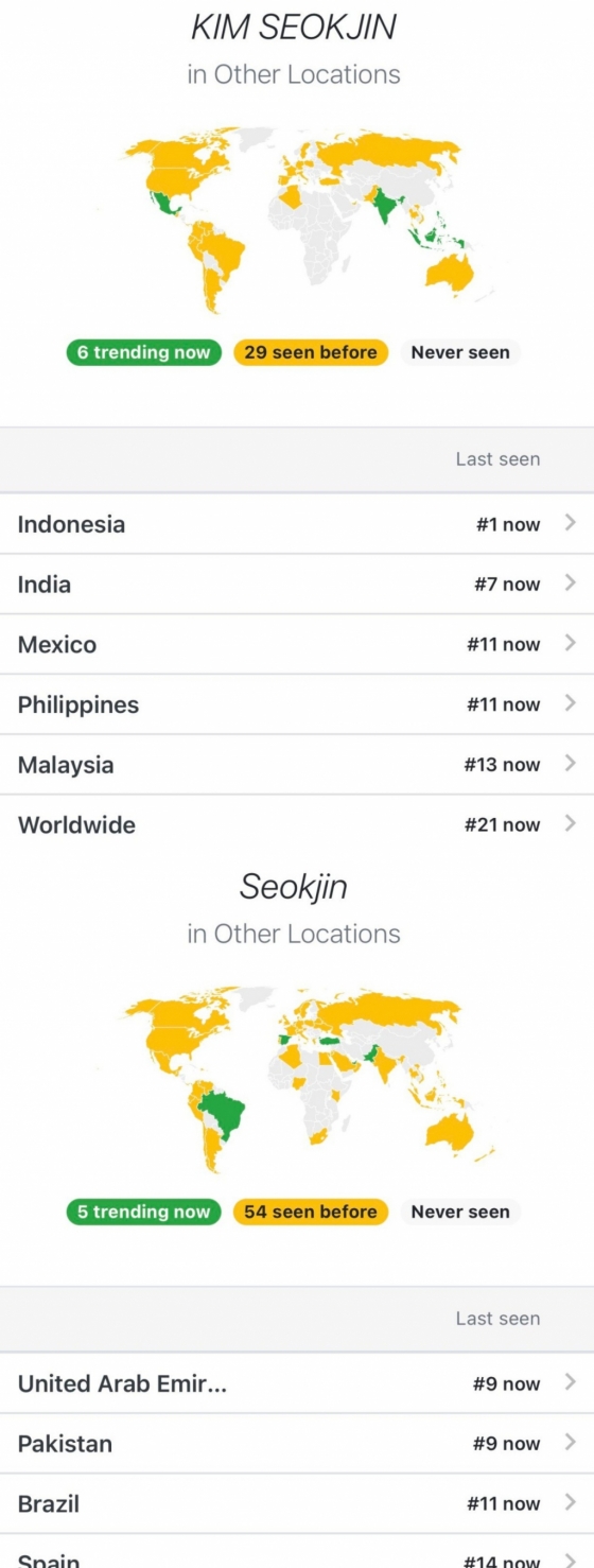 셀카 공개 후 진의 본명인 'KIM SEOK JIN', 'Seokjin'이 인도네시아 실시간트랜드 1위, 브라질 실시간트랜드 6위, 파키스탄과 아랍에미리트(UAE) 실시간트랜드 9위 등 전세계 트랜드를 뜨겁게 달구며 진의 글로벌 인기를 입증했다.