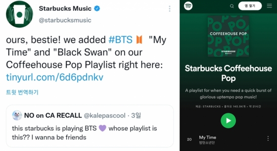 또 방탄소년단의 곡으로는 '시차'와 블랙 스완(Black Swan)' 단 2곡만이 스타벅스 플레이리스트에 올라 있다.