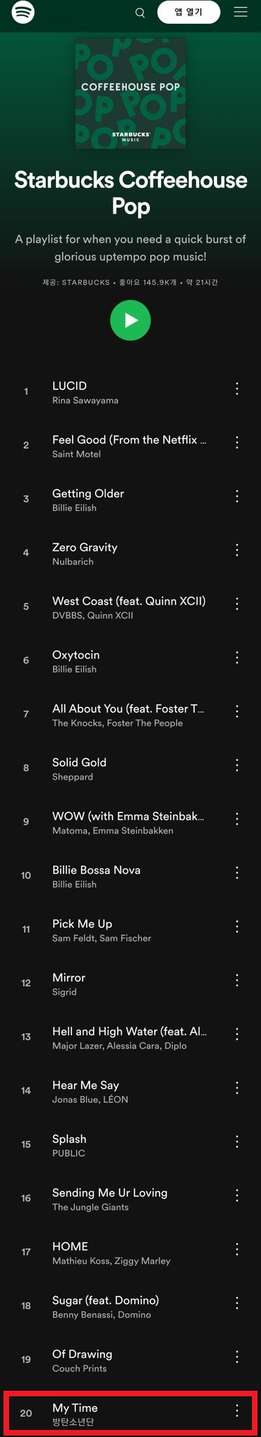 스타벅스 플레이 리스트에는 총 400곡이 담겨 있고 이 중 K팝은 10곡도 채 되지 않는다는 점에서도 '시차'의 인기와 정국 보컬의 파워를 엿보게 했다.