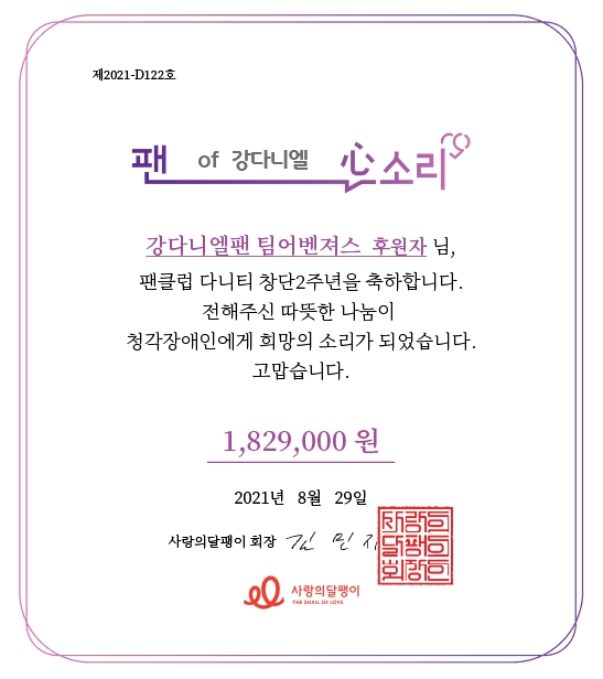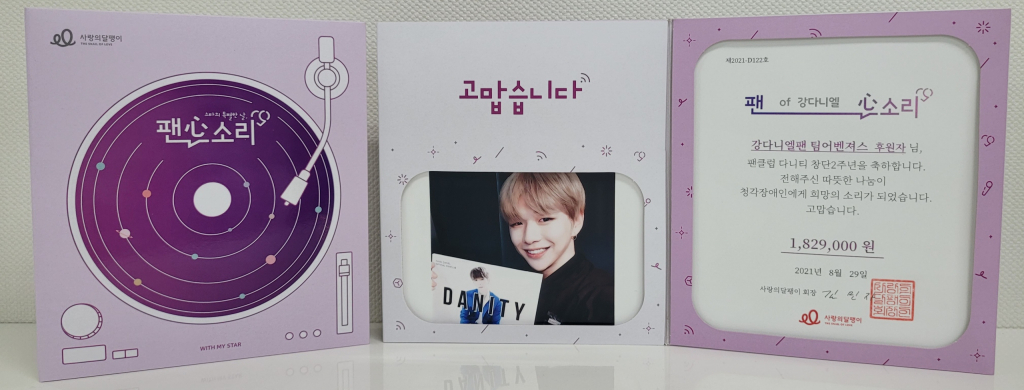 강다니엘 팬클럽 '다니티'의 강다니엘 팬 팀어벤져스는 8월 29일 팬클럽 창단 2주년을 기념해 사랑의 달팽이에 182만 9000원을 기부했다.