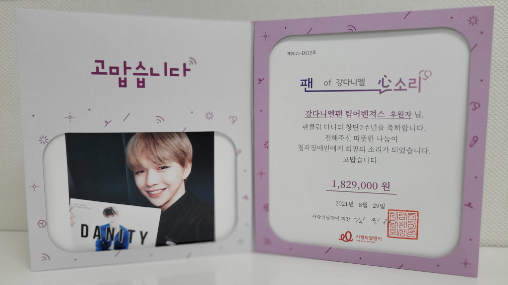 가수 강다니엘(KANG DANIEL)의 팬클럽 다니티(DANITY)가 창단 2주년을 맞아 청각 장애인을 위한 기부로 선한 영향력을 실천했다.