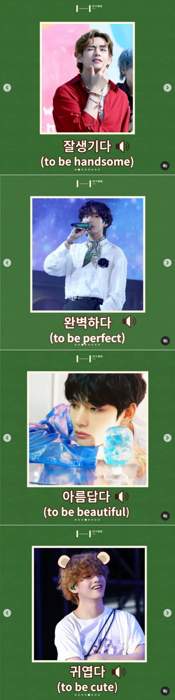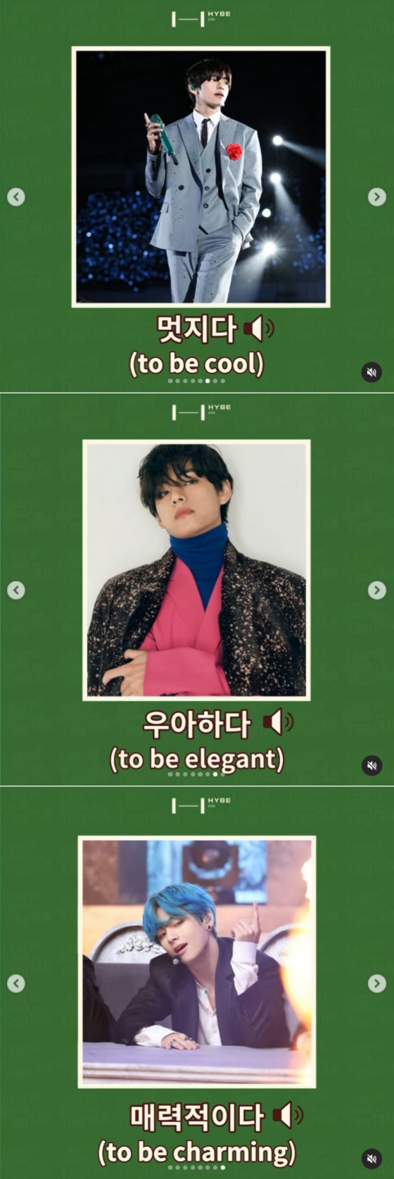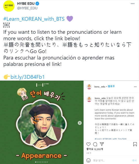 하이브 교육 부문 자회사 하이브에듀(HYBE EDU)가 선보이고 있는 'Learn! KOREAN with BTS'에는 뷔의 사진과 함께 각각의 한국어 단어 설명을 덧붙였다.
