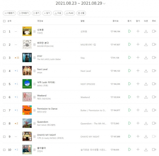 이무진의 '신호등'과 MBC '놀면 뭐하니?'의 음악프로젝트 MSG워너비(M.O.M) '바라만 본다'가 각각 1, 2위로 견고하게 상위권을 사수하고 있는 가운데 무서운 기세로 The Kid LAROI, Justin Bieber 'STAY'가 추격하고 있는 만큼 차주 음원차트 정상을 누가 차지 할 것인지 궁금증을 낳고 있다.