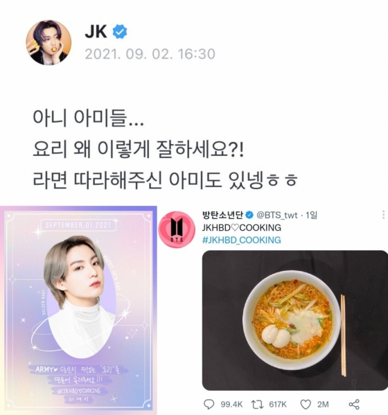이후 오후 5시, 정국은 방탄소년단 공식 트위터에 'JKHBD♡COOKING, #JKHBD_COOKING' 라는 글, 해시태그와 함께 직접 만든 라면 요리 사진을 인증하는 게시글을 올렸다.