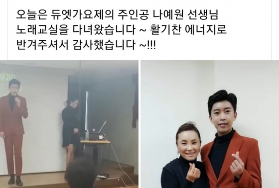 나예원은 "2017년 가을 어느날 가수 후니용이로부터 노래를 정말 잘하는 신인 가수가 있는데 선생님 노래 교실을 투어를 시켜보고 싶다는 제의를 받았다"며 "그리고 영웅 씨는 저와 만나게 됐고 저의 노래 교실에 와서 노래를 하는 모습에 많은 수강생분들이 정말 아름다운 박수를 많이 보내줬다"고 밝혔다.