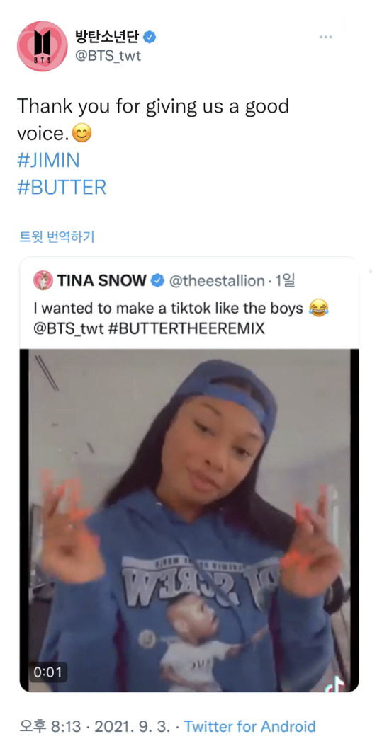 방탄소년단 지민과 BTS의 히트곡 '버터' 리믹스 버전을 함께 작업한 미국의 유명 래퍼 메건 디 스탤리언(Megan Thee Stallion)의 훈훈한 소통이 화제다.