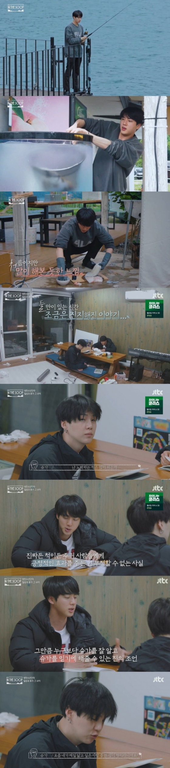 멤버들과 속마음을 터놓고 대화를 나눌 때 슈가에게 따뜻한 조언을 하는 맏형의 모습도 그려졌다. 진은 슈가가 자신이 한 일을 두고 후회를 한다고 말하자 "이미 네가 이룬 좋은 결과들이 많은데 굳이 그런 것에 대해 이런 생각을 안 했으면 좋겠다"며 "난 인생에 후회를 많이 하며 살지 않는다"고 밝히기도 했다. 슈가는 "요즘 제가 제일 닮고 싶은 사람 중의 한 명이 형"이라고 진의 긍정의 힘에 탄복한 바 있다.