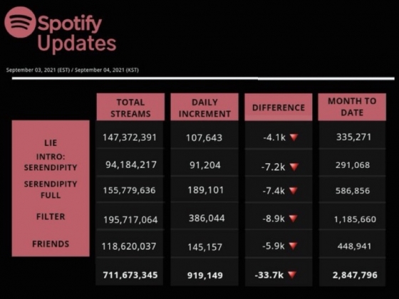 지난 1월 11일 스포티파이에서는 한국 솔로곡 최초로 2억 스트리밍을 넘은 세렌디피티(Intro+Full Length Edition)는 9월 3일 스포티파이에서 각각 1억 5577만 + 9418만 스트리밍을 기록, 전체 2억 4995만 스트리밍이라는 대기록 행진 중이다.