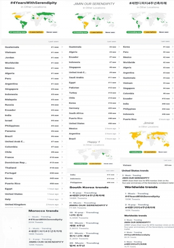 #4YearsWithSerendipity 와 #세렌디피티4주년축하해 가 트렌딩되었으며 미국 5위에 JIMIN OUR SERENDIPITY 가 올랐다.