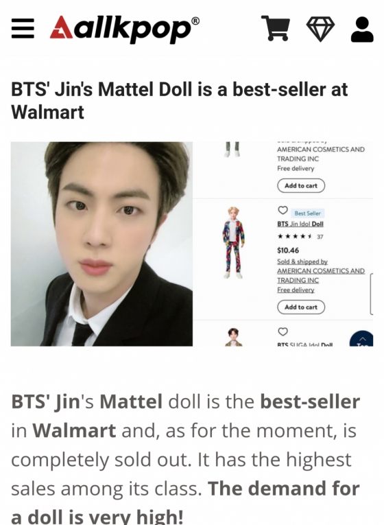 미국 매체 올케이팝(Allkpop)은 최근 '월마트 베스트셀러가 된 방탄소년단 진의 마텔 인형'이라는 기사를 통해 진의 마텔(Mattel) 인형이 미국 월마트(Walmart)에서 베스트셀러로 등극하며 역대급 매출을 기록하고 있다고 전했다. 진의 인형은 현재 품절 상태이고, 재입고 요청이 어마어마하다고도 덧붙였다.