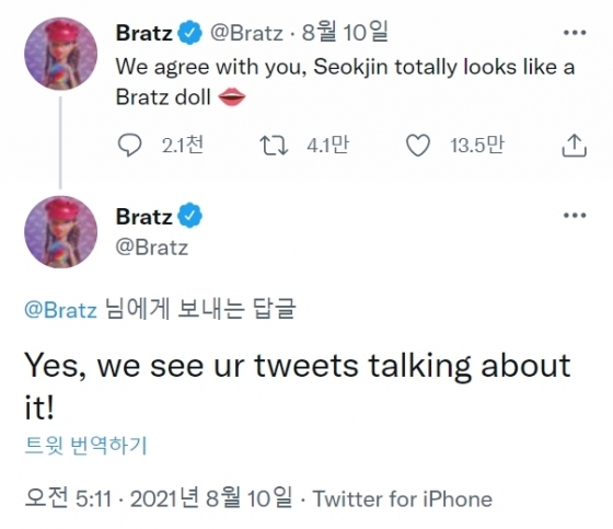 미국의 유명한 패션 인형 브랜드 '브랏츠(Bratz)'는 지난 달 10일 공식 트위터 계정에 'We agree with you, Seokjin totally looks like a Bratz doll(우리는 너에게 동의한다, 석진은 완전히 브라츠 인형 같아)'라는 문구와 함께 입술 모양의 이모지를 게재, 진의 비현실적인 미모와 독보적인 존재감을 인증해 팬들의 열렬한 호응을 받았다.