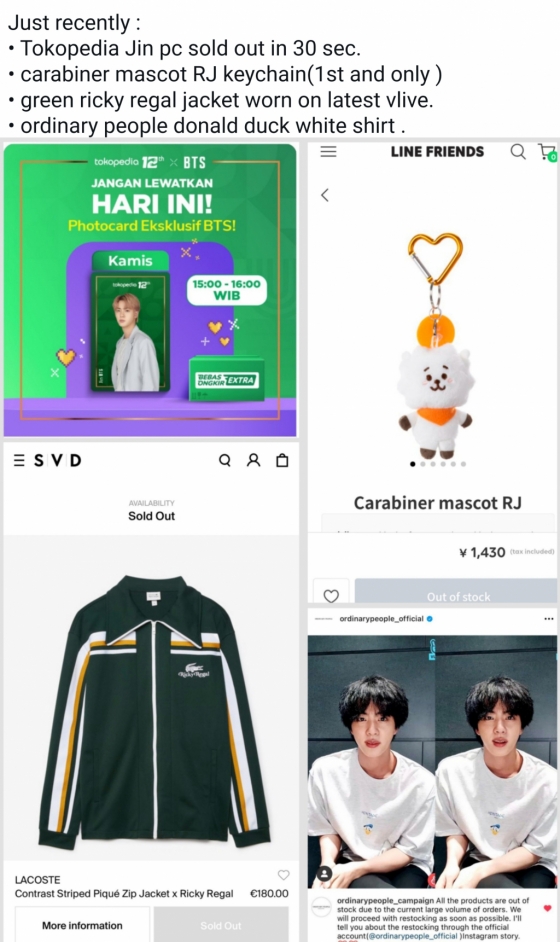 이런 사실들은 진이 완판남 임을 여실히 증명한다며 최근만 해도 토코피디아 진 포토카드 30초만에 매진된 것과 더불어 카라비너 마스코트 RJ 키체인, 최신 vlive에서 착용한 초록색 리키 리갈 재킷, 오디너리 피플의 도널드 덕 흰색 셔츠 등이 품절됐다고 밝혔다. 또한 지난 달 13일 공개된 휠라(FILA)의 'Find Your Basics 2021 FILA FALL COLLECTION' 가을 콜렉션 영상에서 진이 입은 토프 브라운 컬러의 후드 티셔츠는 방탄소년단 멤버들이 입은 의상 중 가장 먼저 품절됐다.