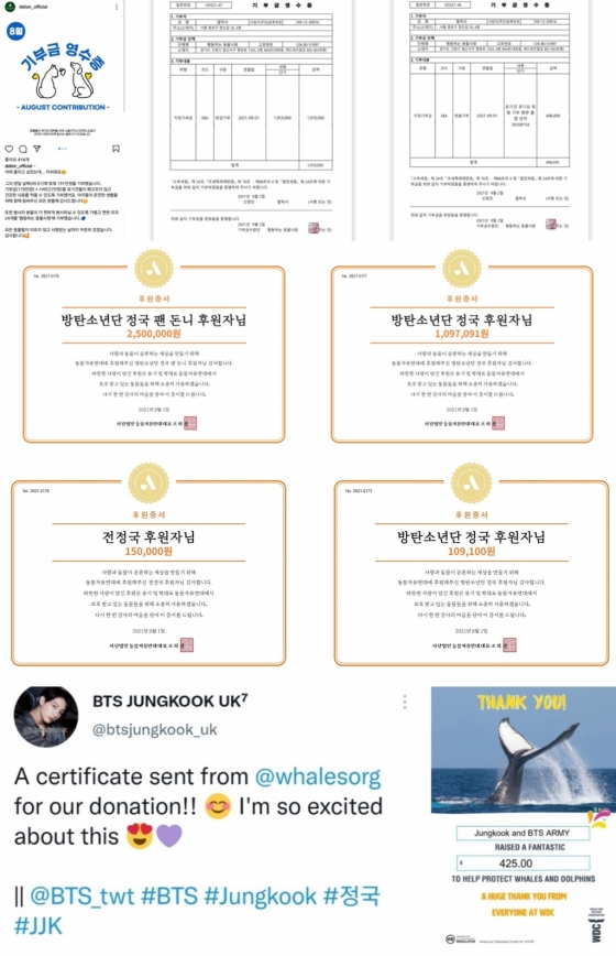 정국의 영국 팬 베이스 'BTS JUNGKOOK UK' 는고래 및 돌고래 보호를 돕기 위한 단체 'WDC'에 정국과 BTS 아미의 이름으로도 기부했다고 트위터를 통해 전했다.
