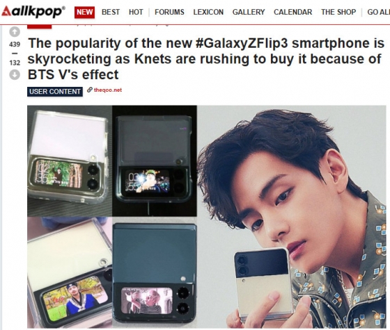 북미매체 올케이팝은 많은 팬들이 Z플립을 구매하고 뷔의 영상으로 외부화면을 꾸민 후기영상을 공유해 구매욕구를 자극하고 있으며, 뷔의 강력한 영향력이 휴대폰의 인기와 판매에 기여했을 것이라고 전했다.
