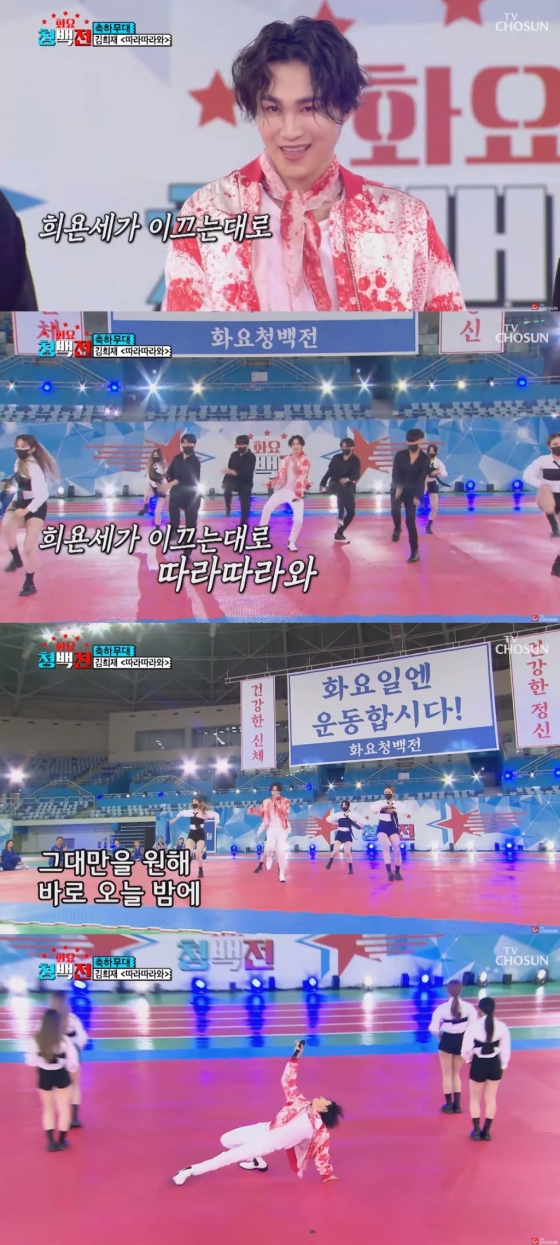 김희재는 체육관 조명 속에서도 빛나는 미모를 과시하며 '트롯 아이돌'다운 화려한 퍼포먼스로 현장의 출연자들을 사로잡았다.