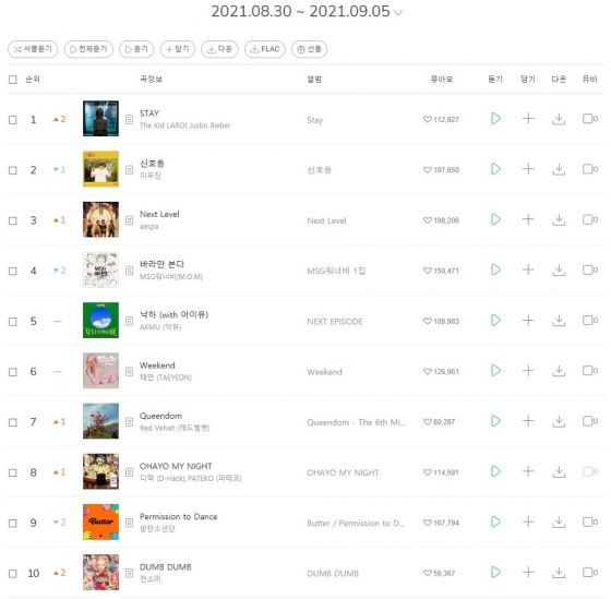 7일 멜론에 따르면 더 키드 라로이, 저스틴 비버의 곡 '스테이'가 9월 1주(8월 30일 ~ 9월 5일) 차 주간차트에서 1위를 기록했다. 외국곡으로는 드물게 꾸준히 상승세를 보여왔던 '스테이'는 이번 주 또다시 2계단 오르며 드디어 정상을 밟았다.