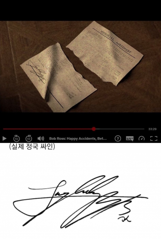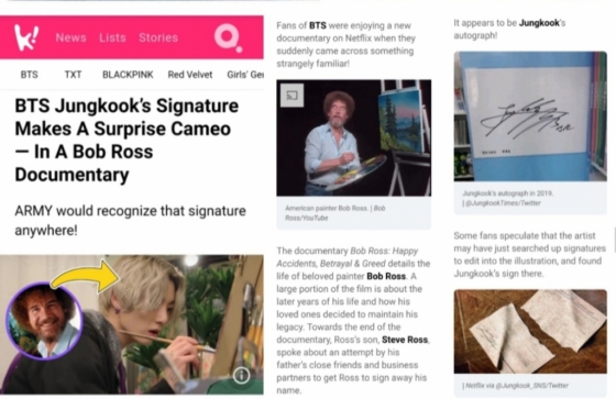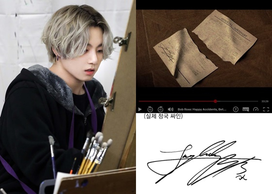 방탄소년단(BTS) 정국의 사인이 화가 밥 로스(Bob Ross)의 다큐멘터리에 깜짝 등장해 눈길을 모았다.