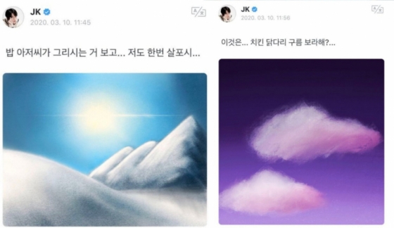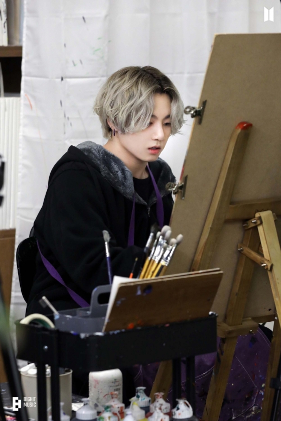 정국은 지난해 방송된 JTBC '인더숲 BTS편'(In the SOOP BTS ver.)에서 "밥 아저씨의 패턴을 보고~"라고 말하며 스케치 없이 붓으로만 과감히 하늘, 강, 산 등이 담긴 아름다운 풍경화를 뚝딱 완성했다.